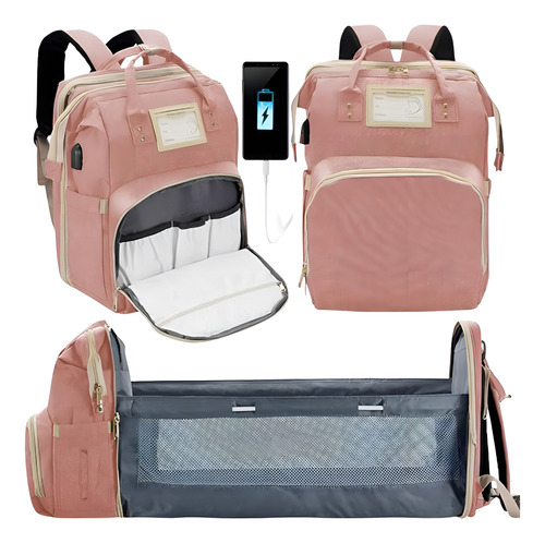 Mochila Pañalera Morral 3 En 1 Cuna Usb Con Cambiador Rosa Nube