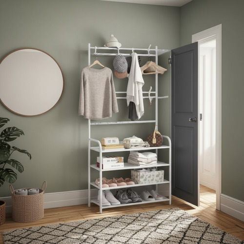 Organizador De Ropa Y Zapatos Tendedero Con Zapatero Estante Blanco